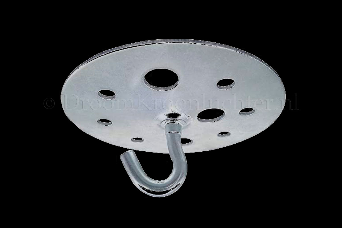 The round plate should be mounted on the ceiling with strong screws. The screw holes are already made in the plate. The plate with hook is sturdy enough to hang a chandelier. The hook makes it very easy to hook a chain or suspension eye so that the chandelier is easy to hang. We have this ceiling plate in different sizes.