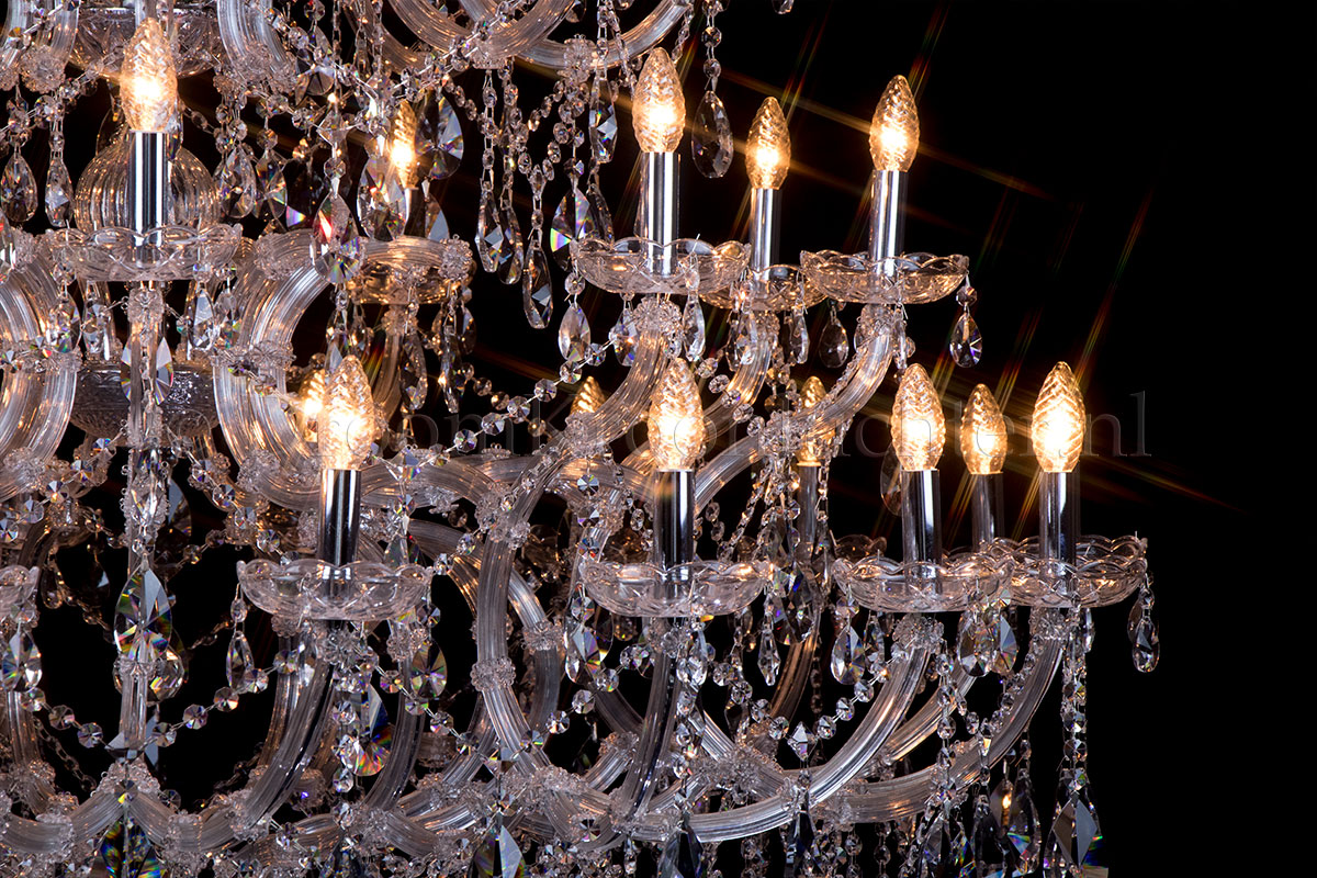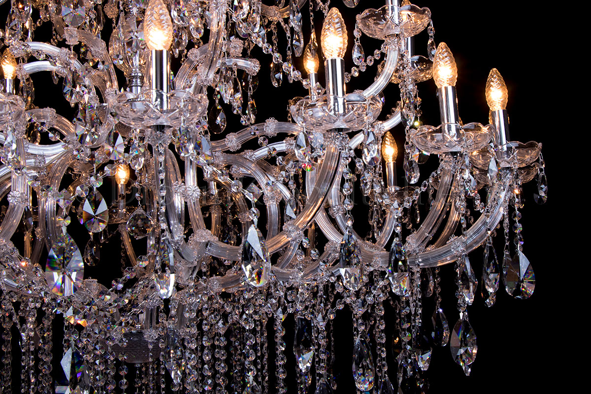 A beautiful chandelier with 28 arms and lights. The crystal chandelier Maria Theresa is chromecolour..