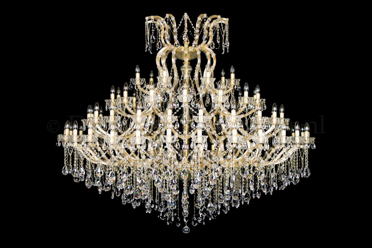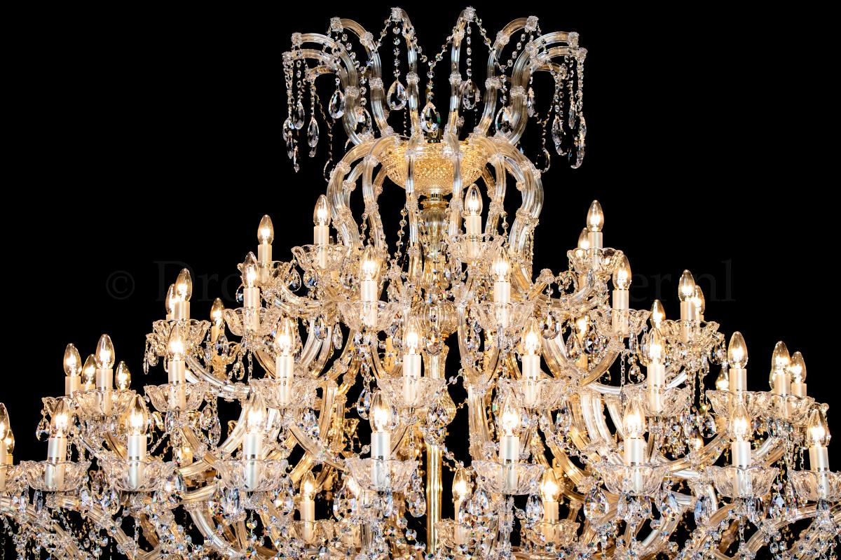 A beautiful crystal chandelier with 77 arms and lights. Due to the limited height (160cm) and larger diameter (200cm), this model is very suitable for larger rooms with a not too high ceiling. The crystal chandelier Maria Theresa is goldcoloured with a perfect finish.
