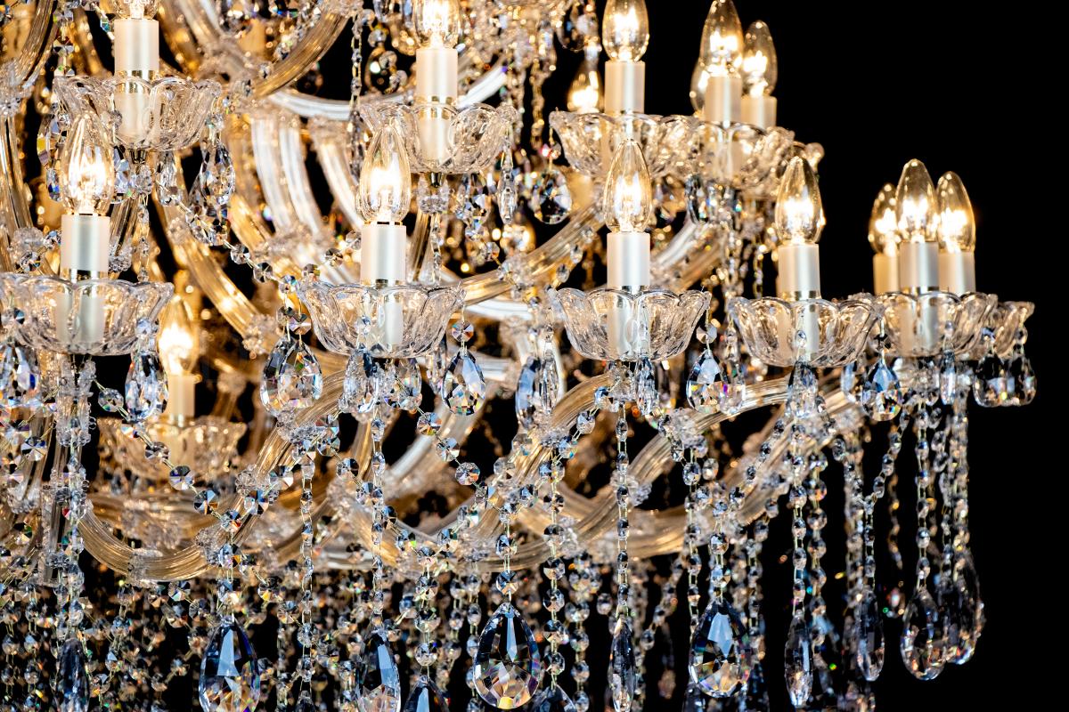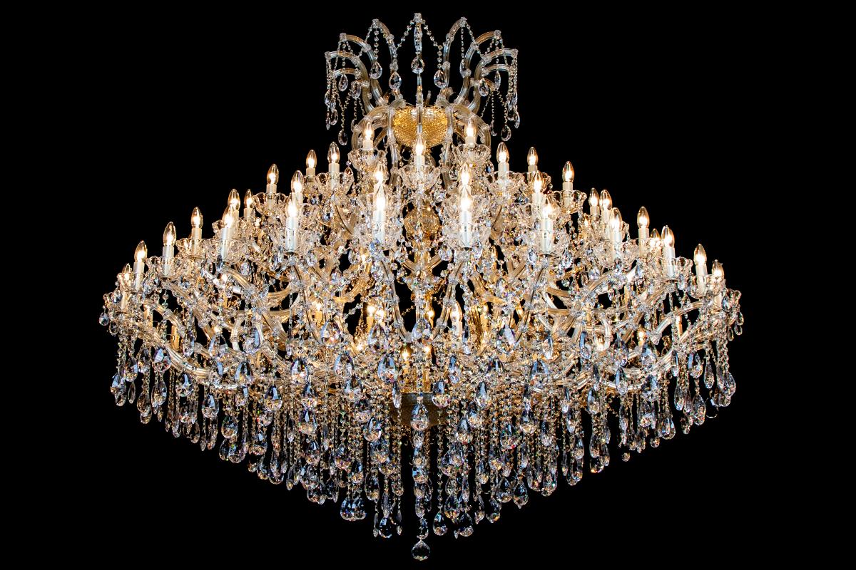 A beautiful chandelier with 60 arms. The crystal chandelier Maria Theresa is gold coloured with a pe..