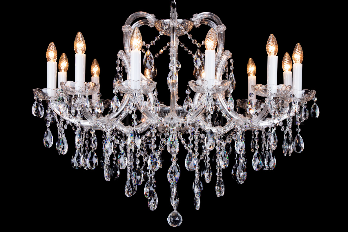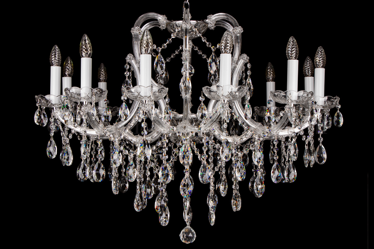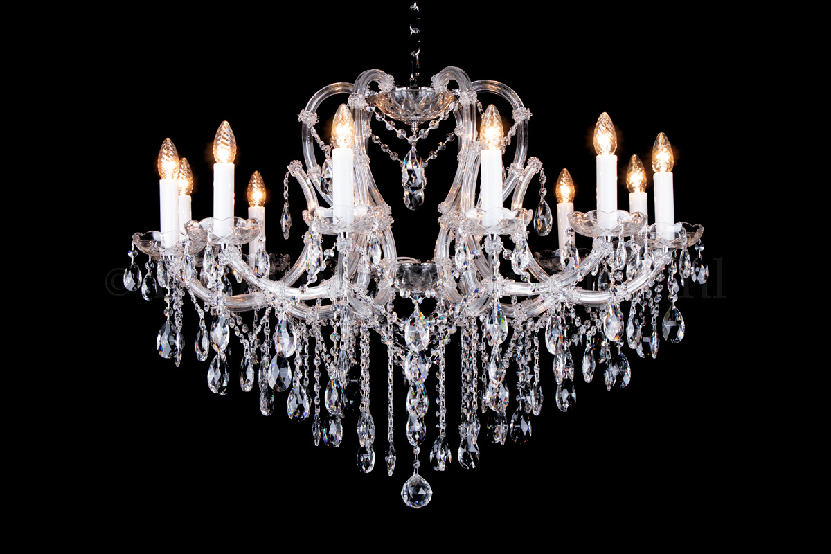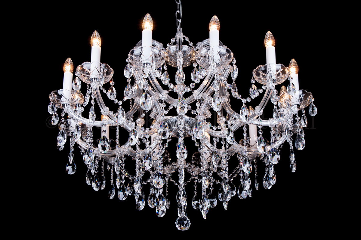 A beautiful chandelier with 28 arms and lights. The crystal chandelier Maria Theresa is chromecolour..