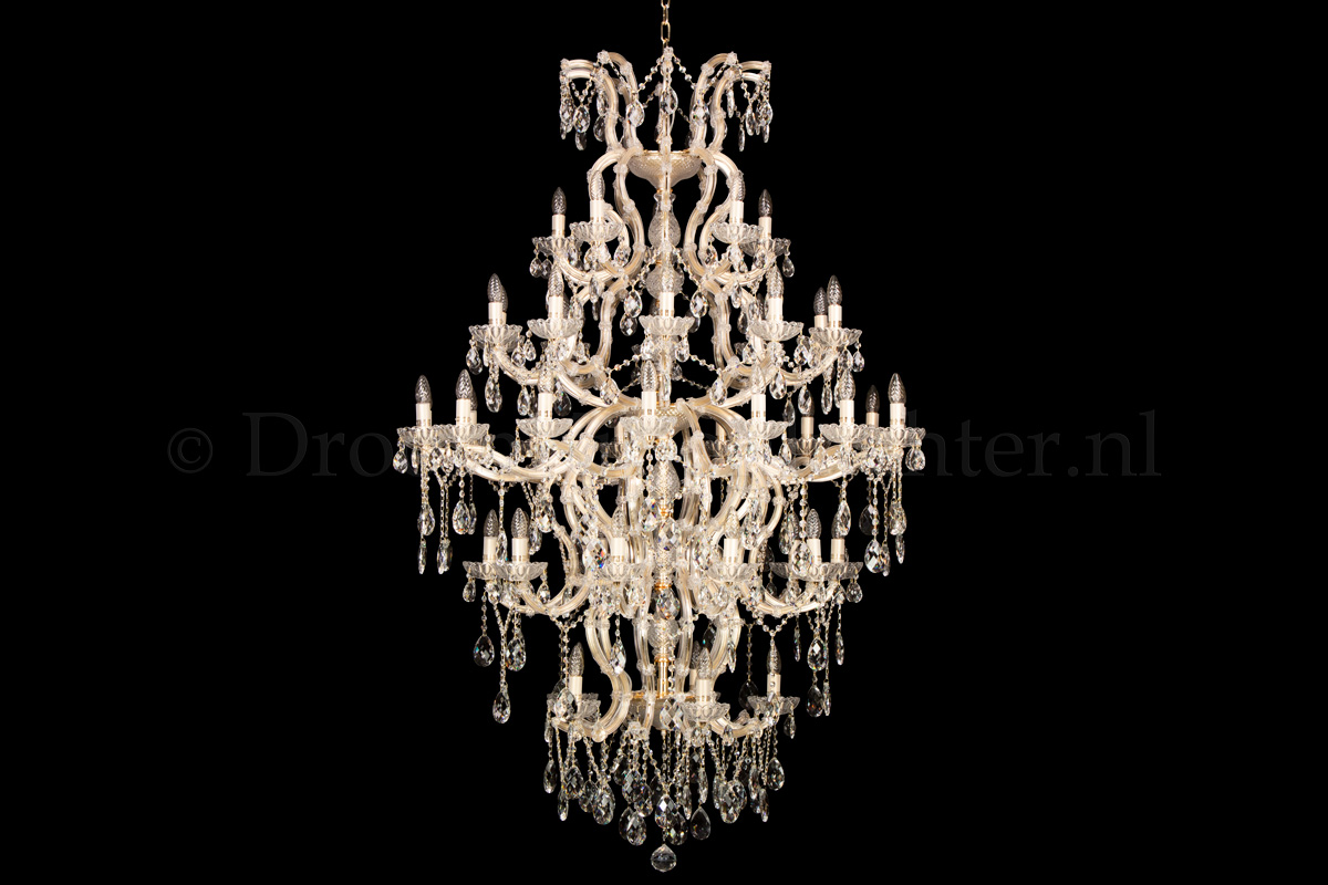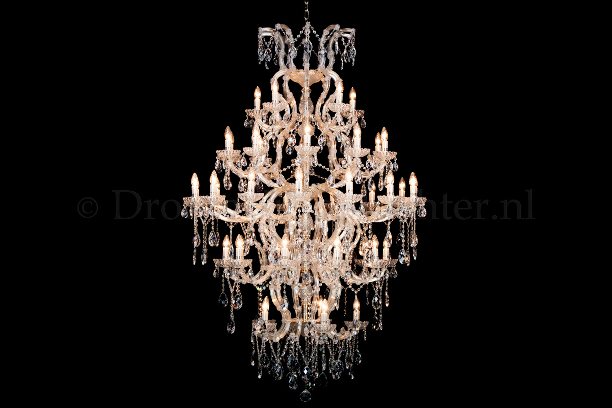 A beautiful chandelier with 45 arms and lights. Due to the limited width (120cm) and greater length (180cm), this model is very suitable for a loft, for example. The crystal chandelier Maria Theresa is goldcoloured with a perfect finish.