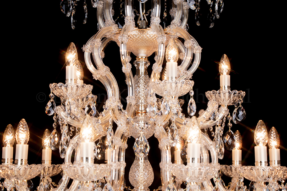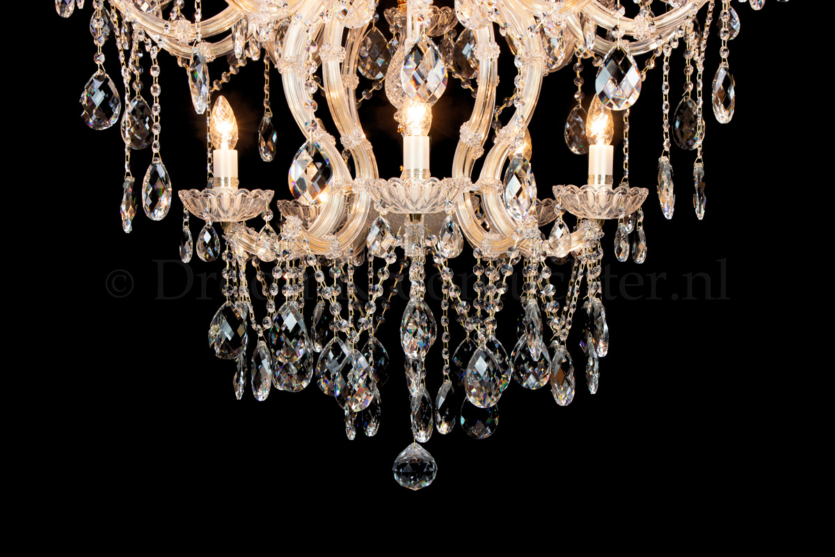 A beautiful chandelier with 24 arms and lights. The crystal chandelier Maria Theresa is chromecolour..