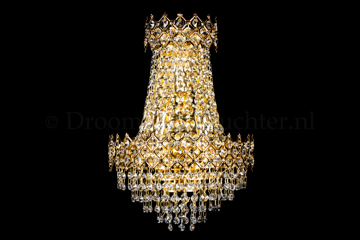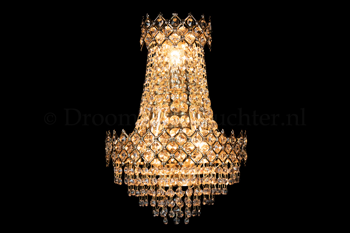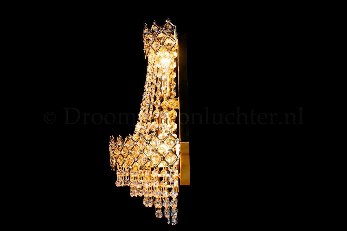 Cette magnifique lampe murale en cristal possède 3 ampoules, mesure 30 cm de large et 45 cm de haut. La bande dorée à carreaux est remplie de cristaux étincelants. C'est comme si une couronne était accrochée à votre mur.