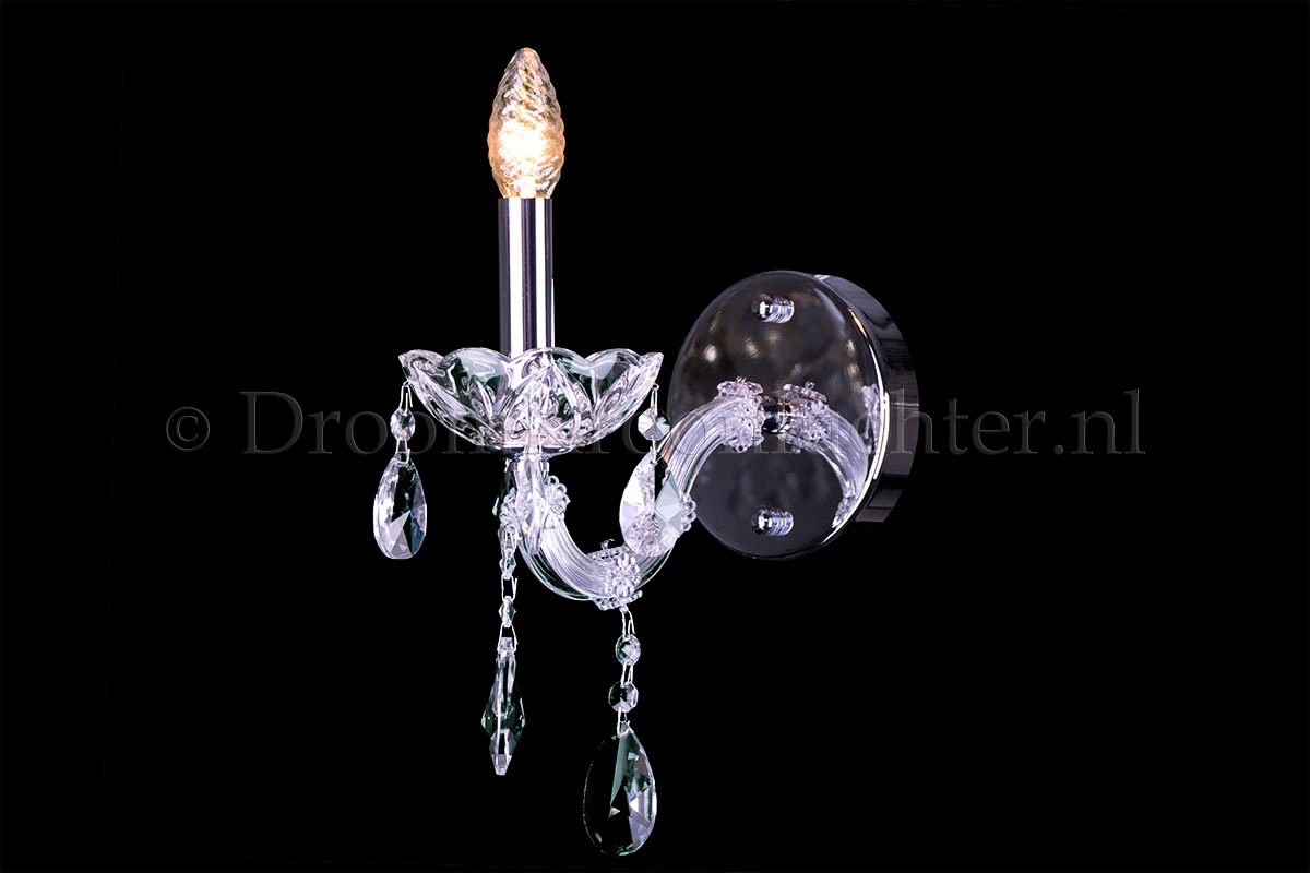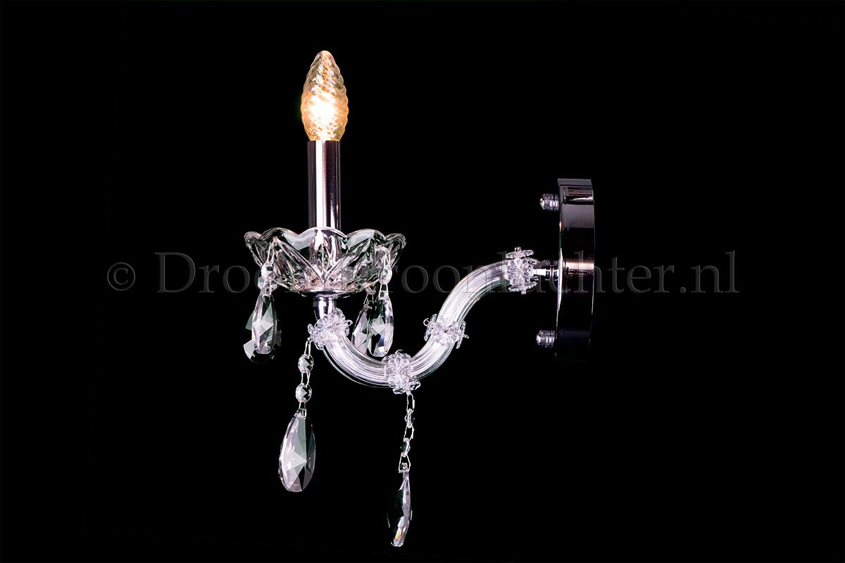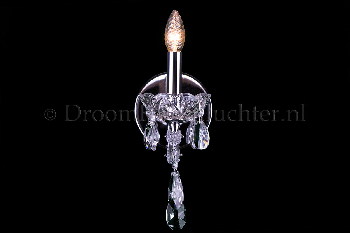 Applique Maria Theresa tres luxe avec 1 ampoule. Le luminaire est en chrome avec des cônes en cristal. Le bras est exécuté en "S".