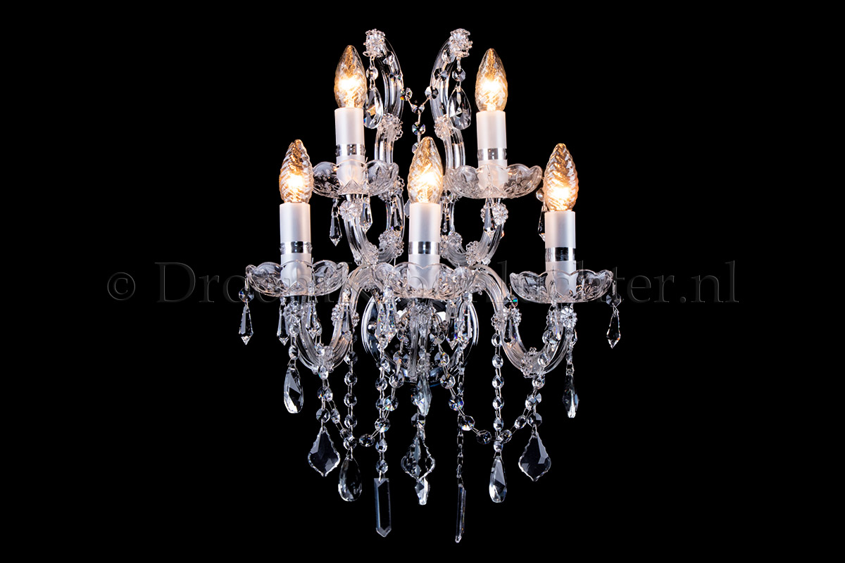 Applique Marie Therèse avec 5 ampoules, répartis sur 2 étages. L' applique est en chrome avec des diamants en cristal. Les douilles de bougie en métal ont une douille en verre matt, ce qui donne à l'applique murale un aspect très luxueux.
