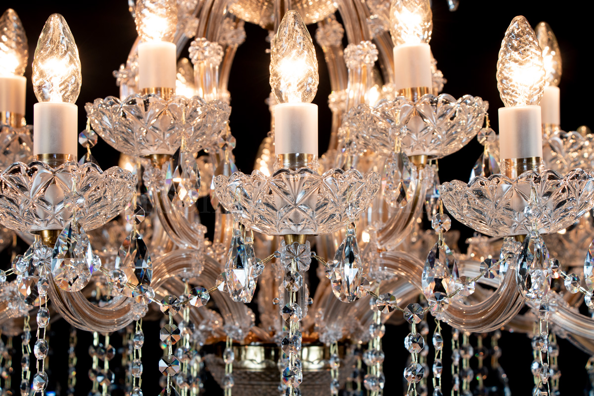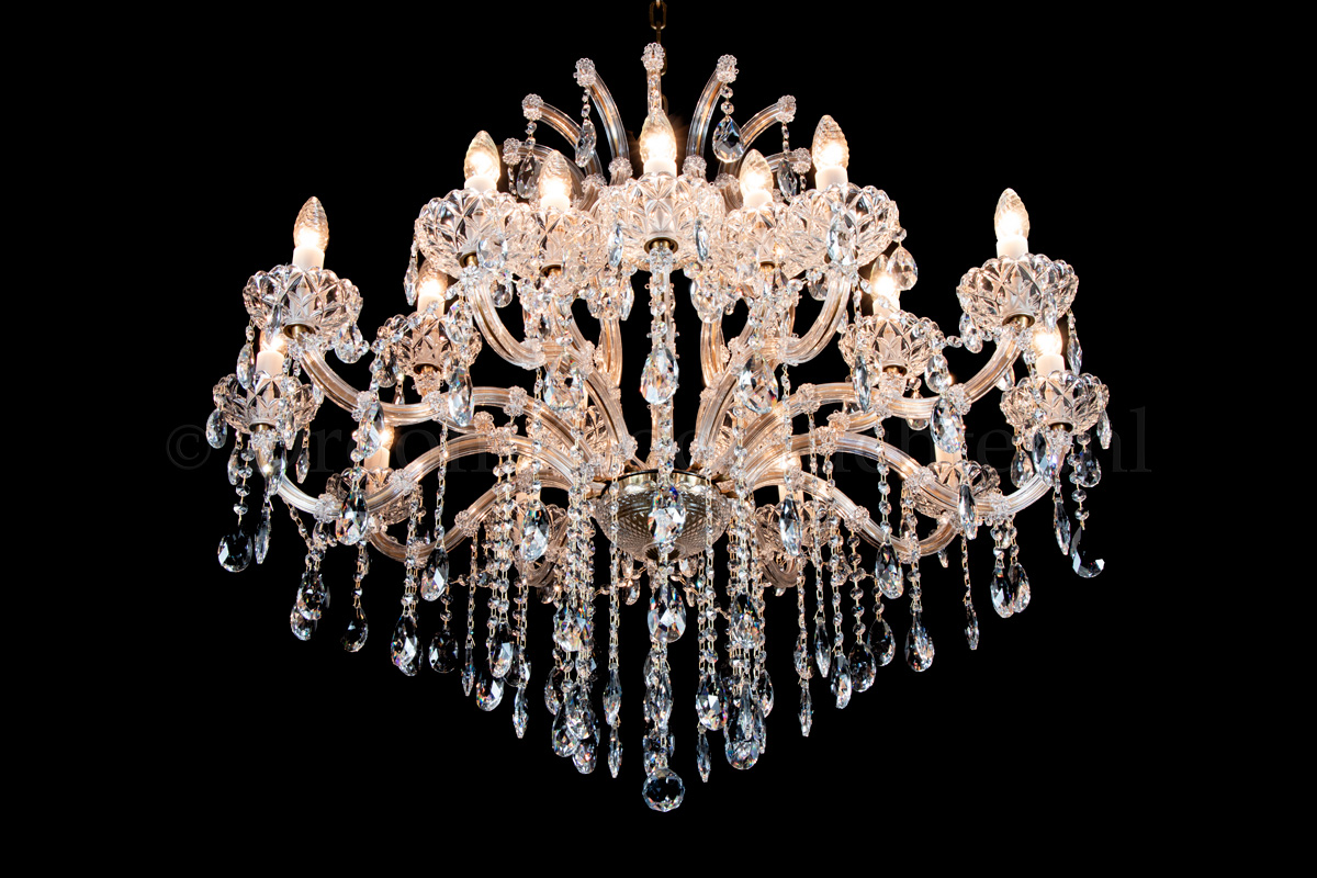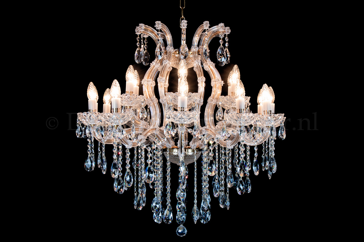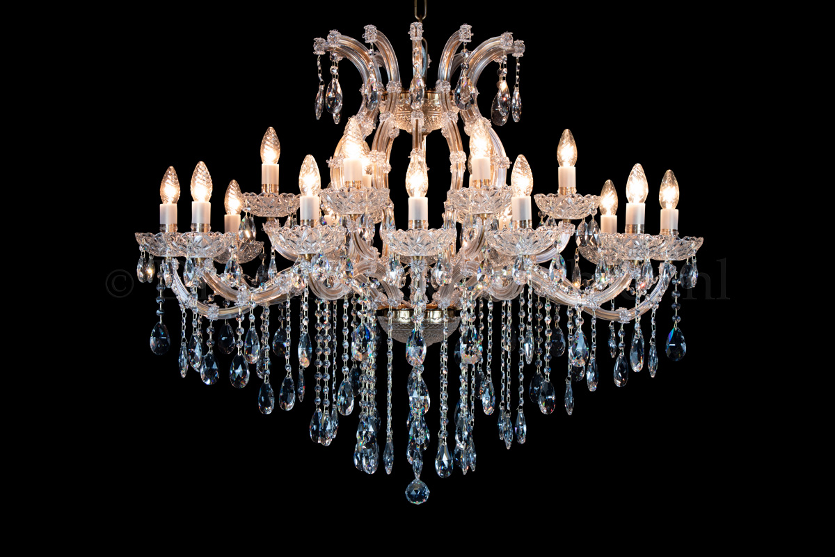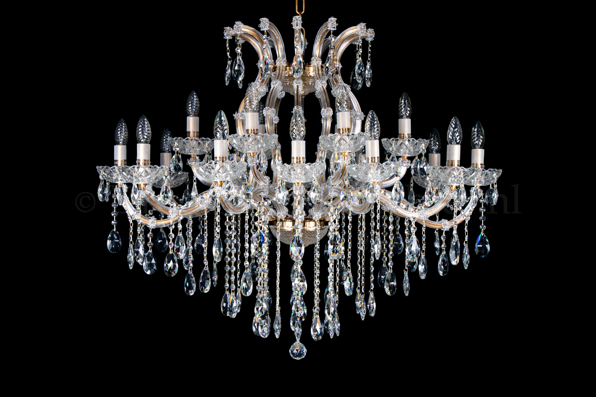 Dans la version de luxe des lustres Maria Theresa, les plats et la colonne centrale ou le vase décoratif sont en verre. Le luminaire est fabriqué en métal de haute qualité et les bras sont entièrement recouverts de verre. Les bobeches sont en verre épais et ont une belle finition. Au-dessus des bobeches gracieux se trouve un fausse bougie en métal, qui est entouré d'un manchon opale givré, de sorte que l'ensemble a un aspect très luxueux.