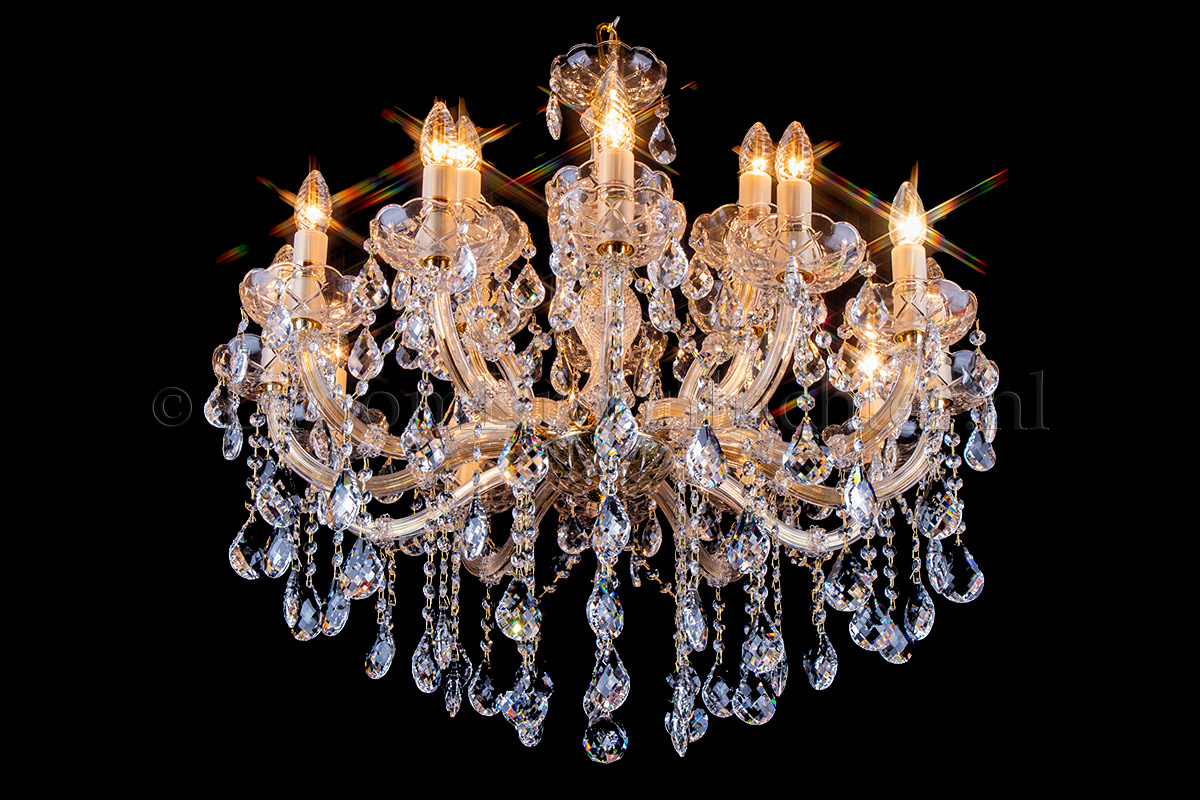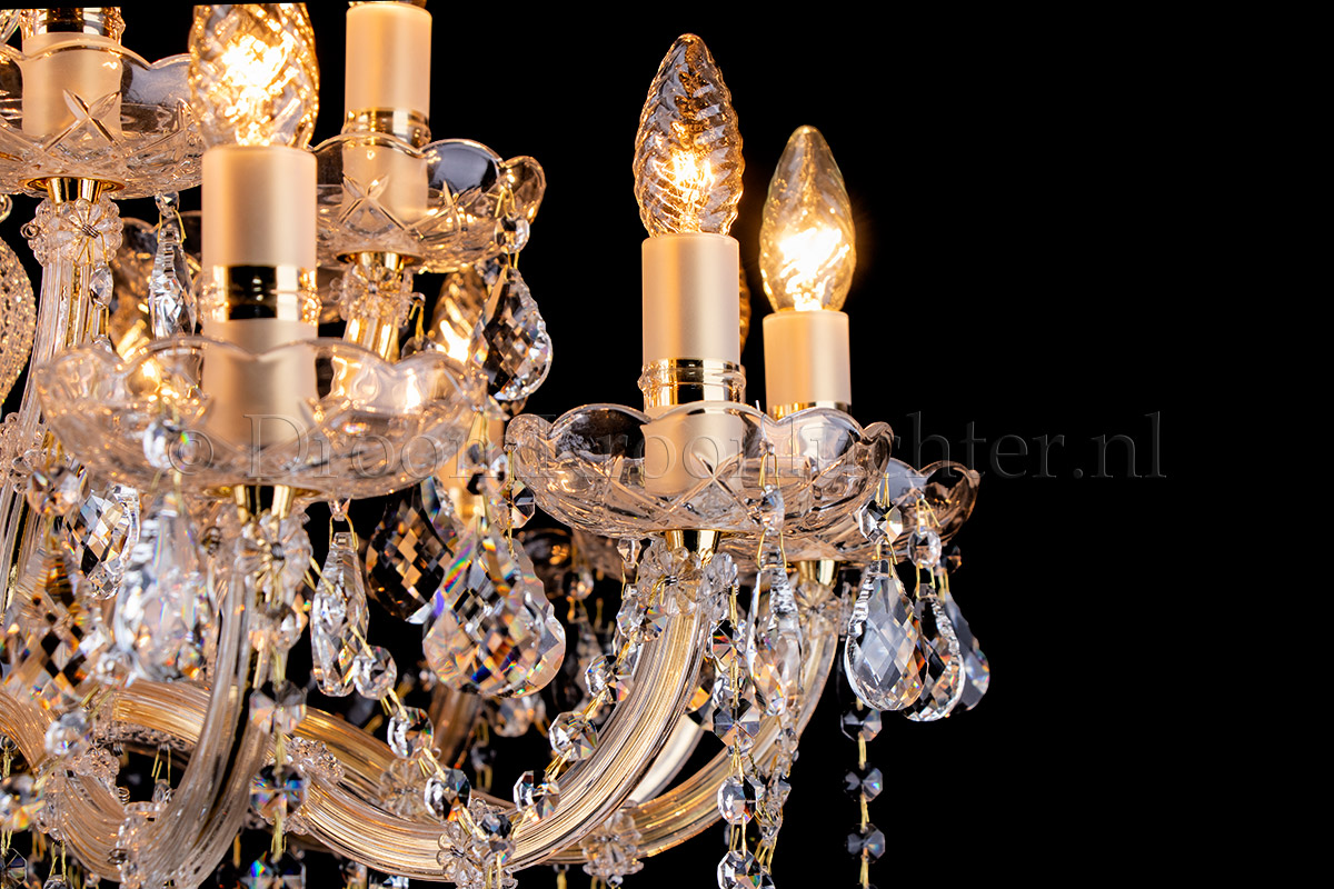 Dans la version de luxe des lustres Maria Theresa, les plats et la colonne centrale ou le vase décoratif sont en verre. Le luminaire est fabriqué en métal de haute qualité et les bras sont entièrement recouverts de verre. Au-dessus des bobeches gracieux se trouve un fausse bougie en métal, qui est entouré d'un manchon opale givré, de sorte que l'ensemble a un aspect très luxueux.
