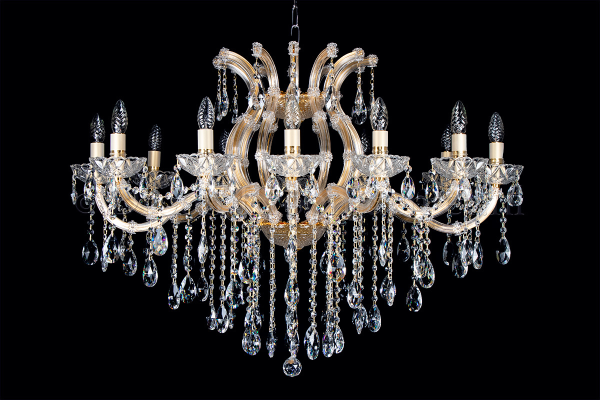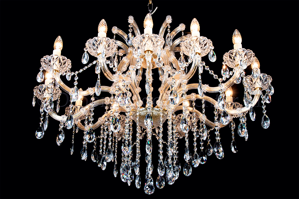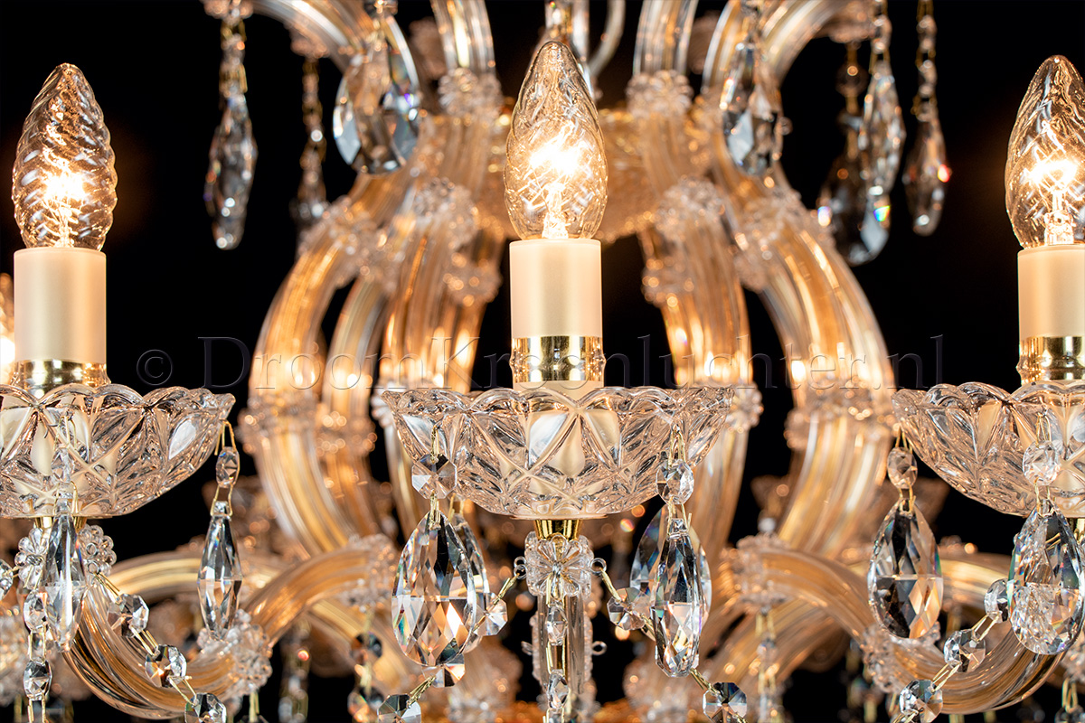 Dans la version de luxe des lustres Maria Theresa, les plats et la colonne centrale ou le vase décoratif sont en verre. Le luminaire est fabriqué en métal de haute qualité et les bras sont entièrement recouverts de verre. Les bobeches sont en verre épais et ont une belle finition. Au-dessus des bobeches gracieux se trouve un fausse bougie en métal, qui est entouré d'un manchon opale givré, de sorte que l'ensemble a un aspect très luxueux.
