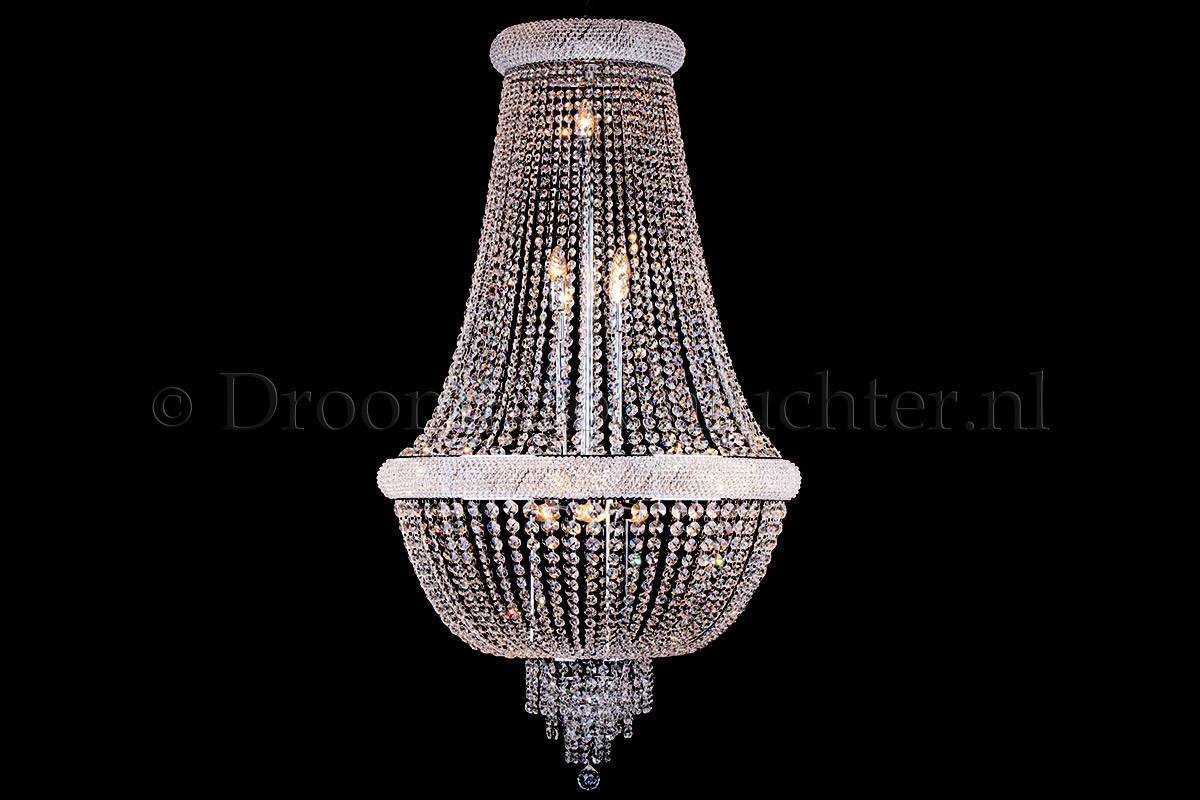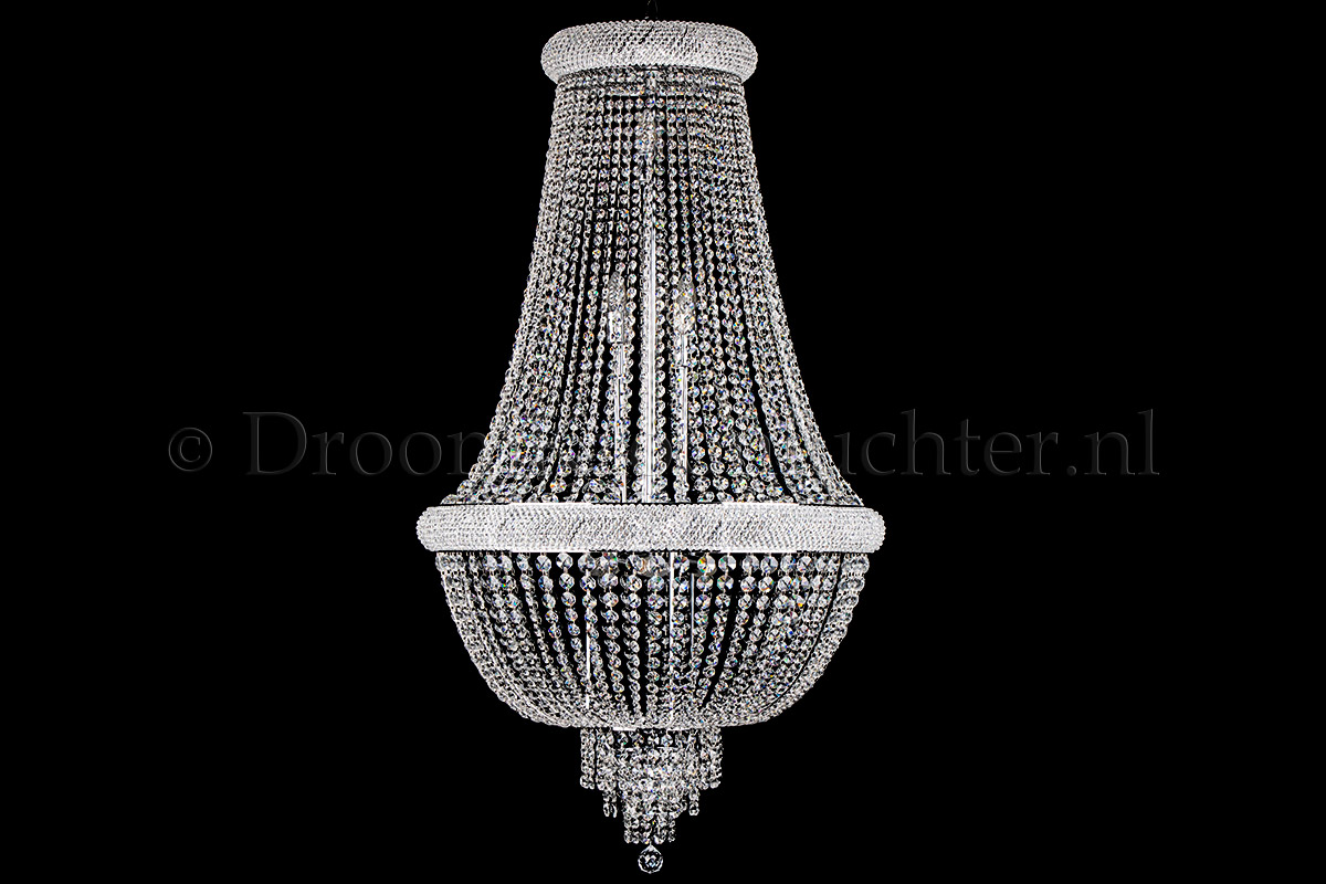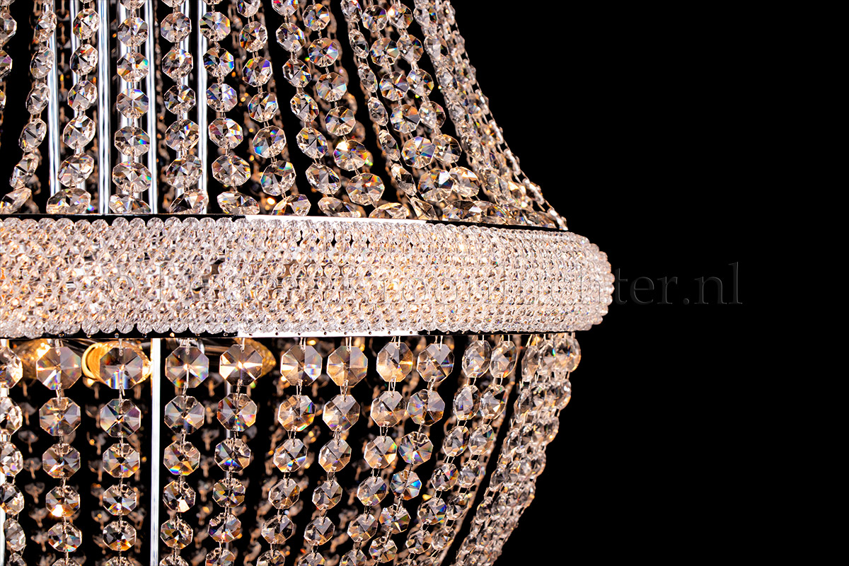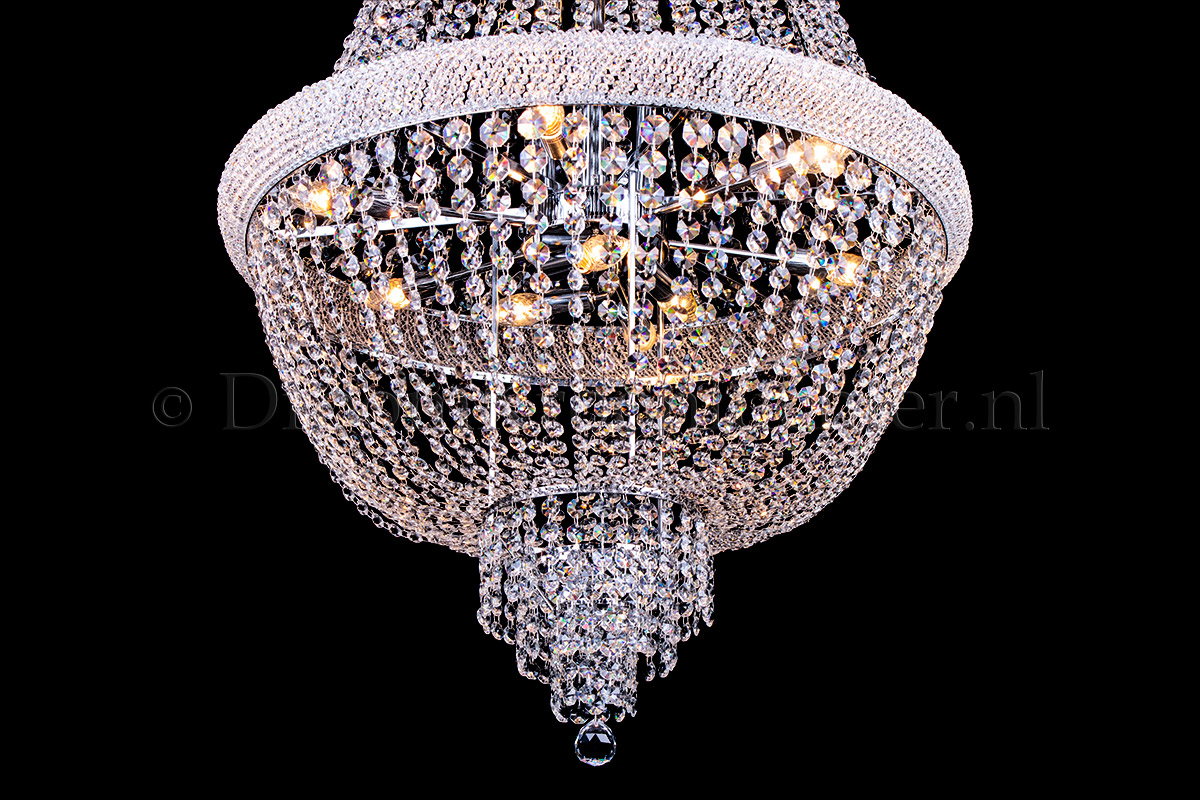 Le lustre empire Pallazo est recouvert de cristal de haute qualité et est parfaitement fini avec des pièces en métal chromé. Les brins sont en cristal de haute qualité avec une belle boule de cristal au fond.