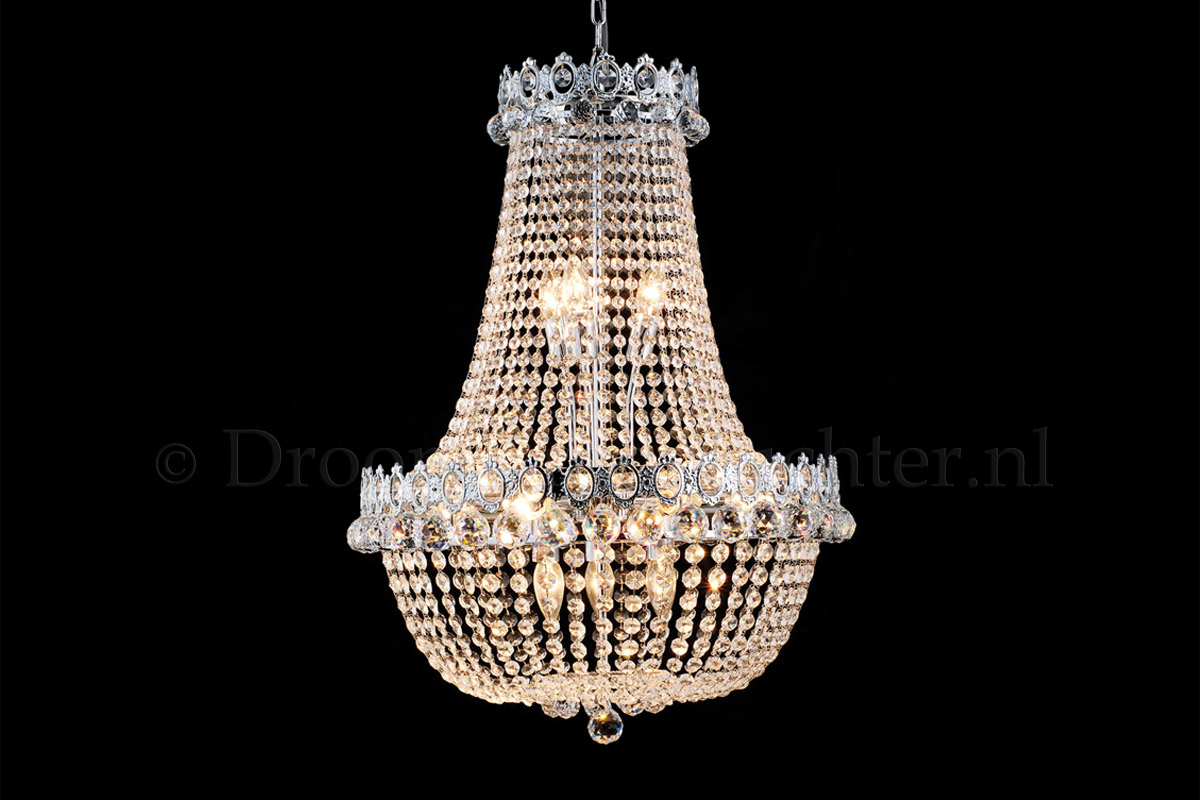 Un magnifique lustre empire avec 12 ampoules et un diamètre de 60 cm et une hauteur d'environ 85 cm. Le lustre Empire Royale est en argent et sa finition est parfaite. Le luminaire est en métal de couleur chrome. Les brins sont en cristal de haute qualité avec une belle boule au fond.