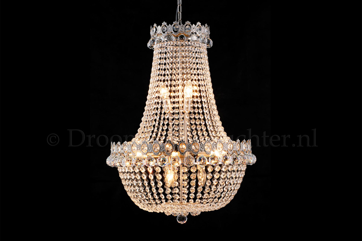 Un magnifique lustre empire avec 12 ampoules et un diamètre de 60 cm et une hauteur d'environ 85 cm. Le lustre Empire Royale est en multi-couleur et sa finition est parfaite. Le luminaire est en métal de couleur chrome. Les brins sont en cristal de haute qualité avec une belle boule au fond.