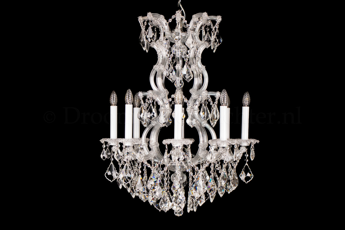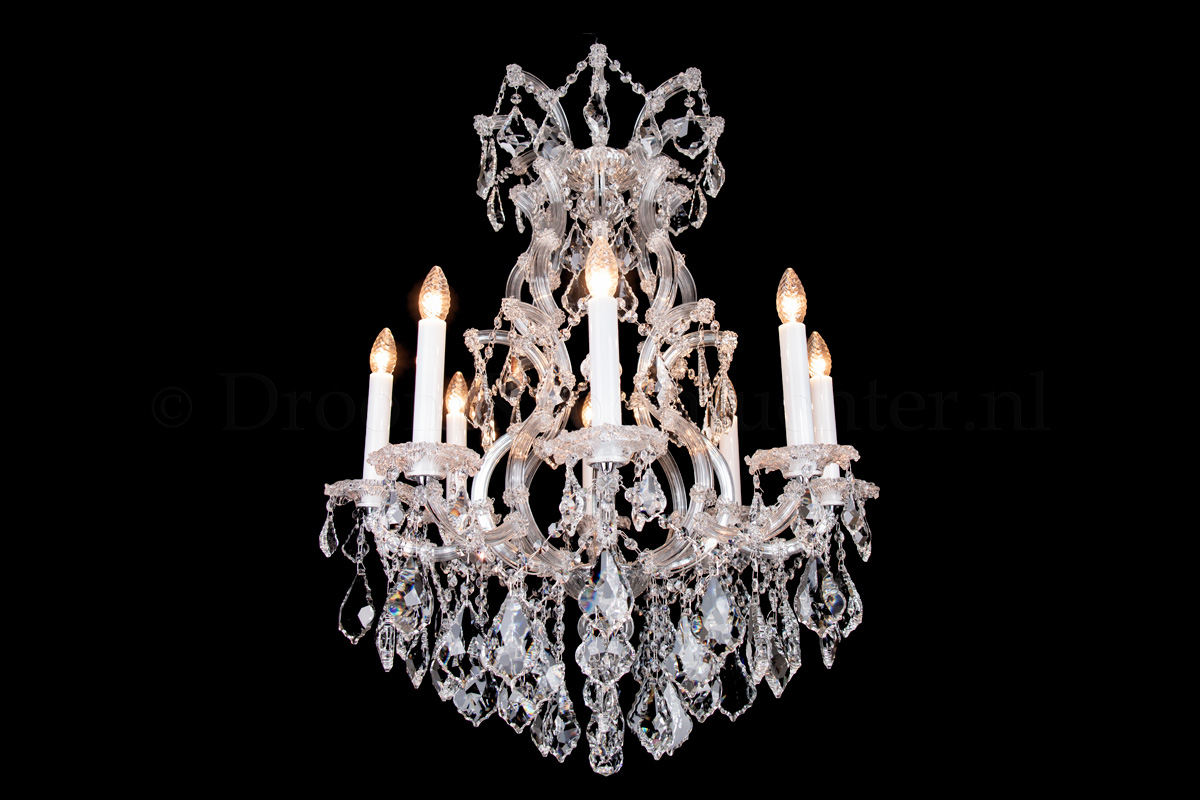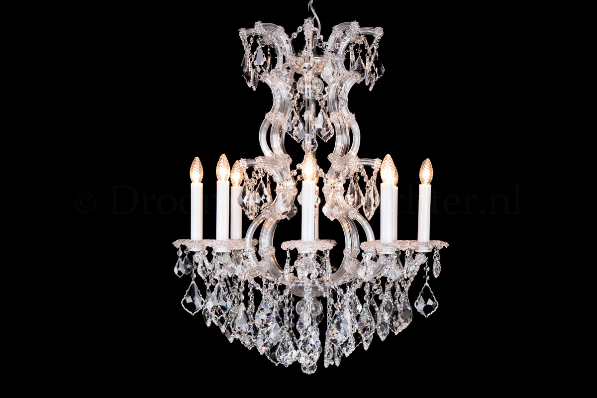 Lustre en cristal décoré avec 8 ampoules. Le lustre Louis Baroque à 8 ampoules est en chrome et présente une finition de haute qualité. Les pampilles sont en cristal, l'armature est une combinaison de métal et de verre. Les douilles de bougie ont une hauteur de 15 cm et sont en verre blanc. Les pendentifs de ce lustre sont très grands, ce qui donne un effet saisissant.