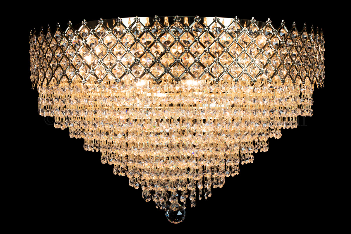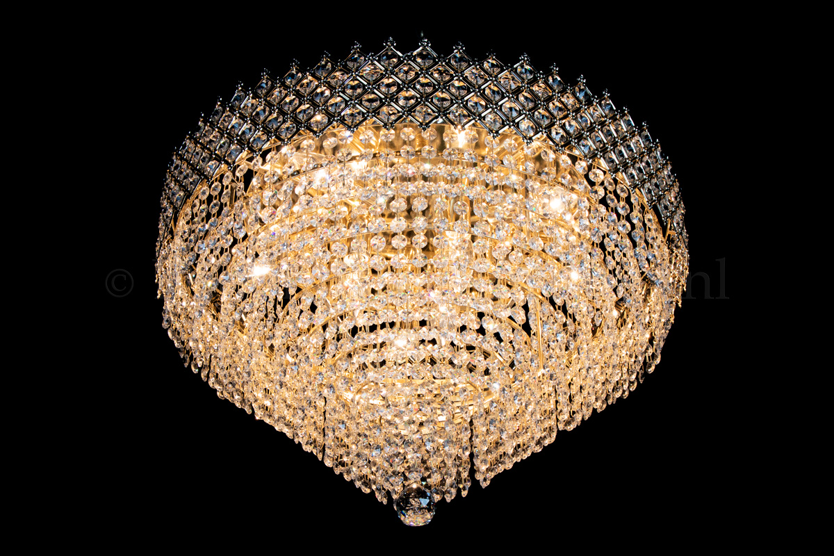Ce magnifique plafonnier, orné de beaux cristaux, avec 9 ampoules, un diamètre de 60 centimètres et une hauteur de 40 centimètres, et ressemble à une couronne inversée. Ce plafonnier a une large bande dorée à carreaux, dont chacune est remplie d'un beau cristal. Le plafonnier en cristal Amy a une allure royale.