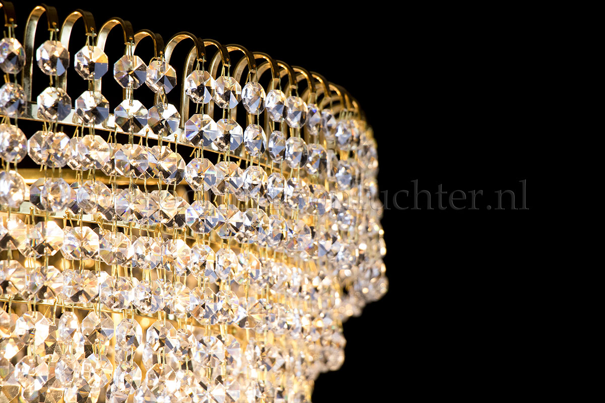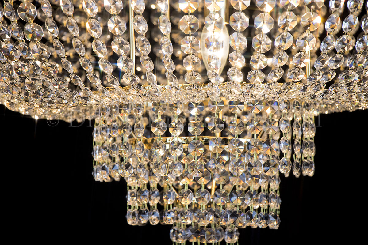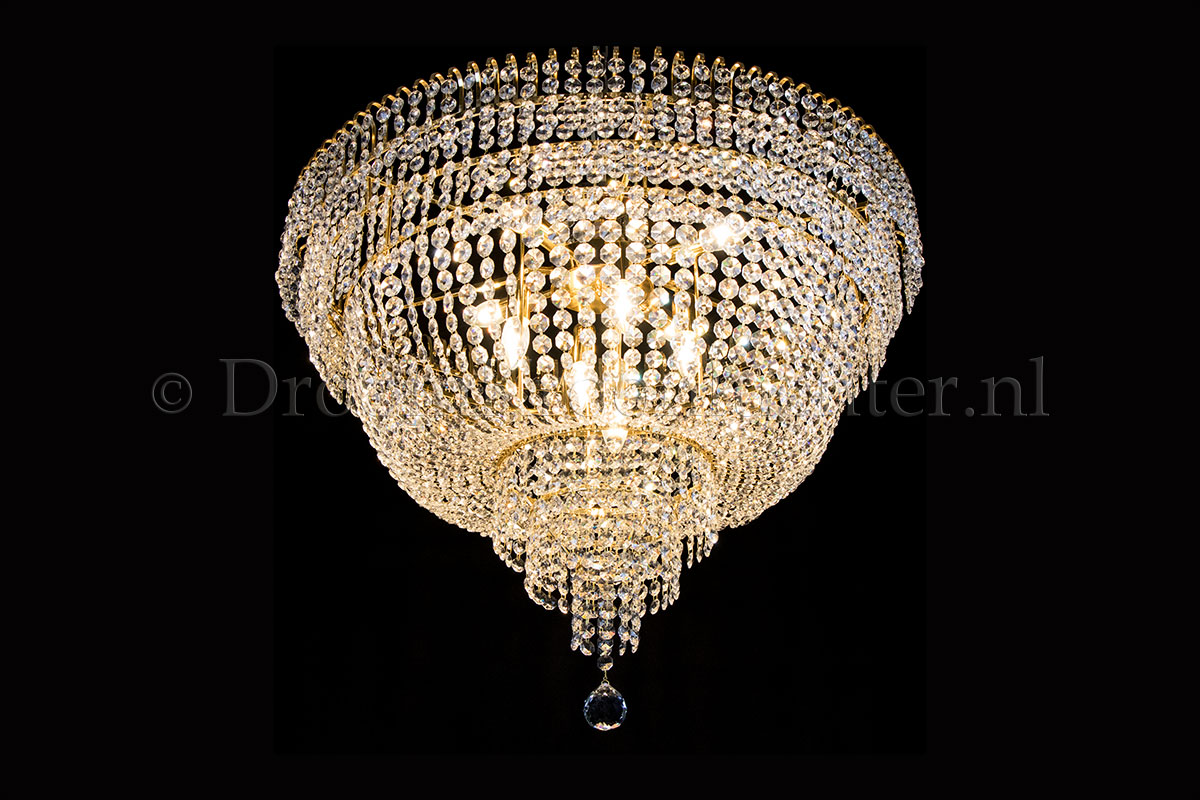 Ce plafonnier classique et multicouche a 9 ampoules, un diamètre de 80 centimètres et une hauteur d’au 65 cm. Ce plafonnier est fabriqué en cristal et possède des bords or. Le plafonnier en cristal Salle de 80 cm de diamètre et de 65 cm de hauteur confère à votre pièce une apparence chaleureuse et attrayante.